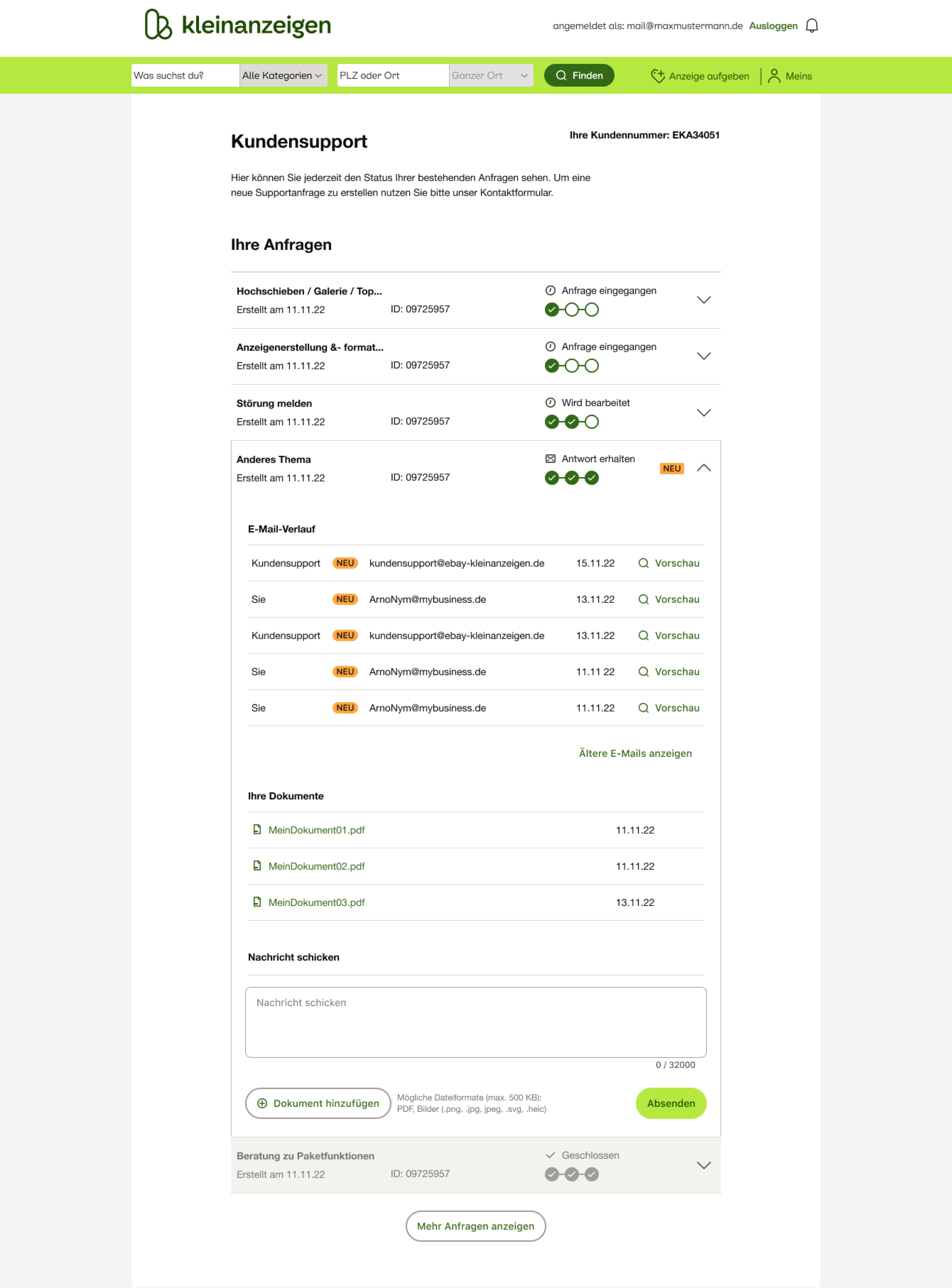The Customer support team wanted to improve the CS system of Kleinanzeigen PRO, a premium offering for business owners on the Kleinanzeigen platform. The main problem was the lack of visibility for users to track the progress of their support tickets, leading to confusion and frustration among users and an increased burden on customer support teams. The main goal of the Customer Care Hub project was to provide users with a clear ticket overview and status updates, reducing the likelihood of submitting duplicate cases and improving overall customer satisfaction.